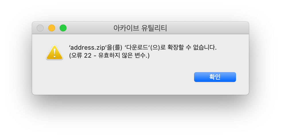 맥에서 zip파일 압축 해제시 오류 22 - 유효하지 않은 변수가 발생했다.